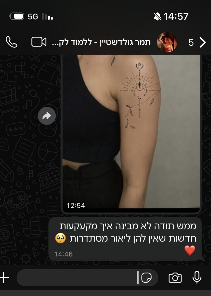 אלה תהליך הכשרה מעמיק שתומך ברגעים הקשים באמת ונותן כלים להתמודדות בהתפתחות האישית שאת עוברת בדרך להיות מקעקעת.